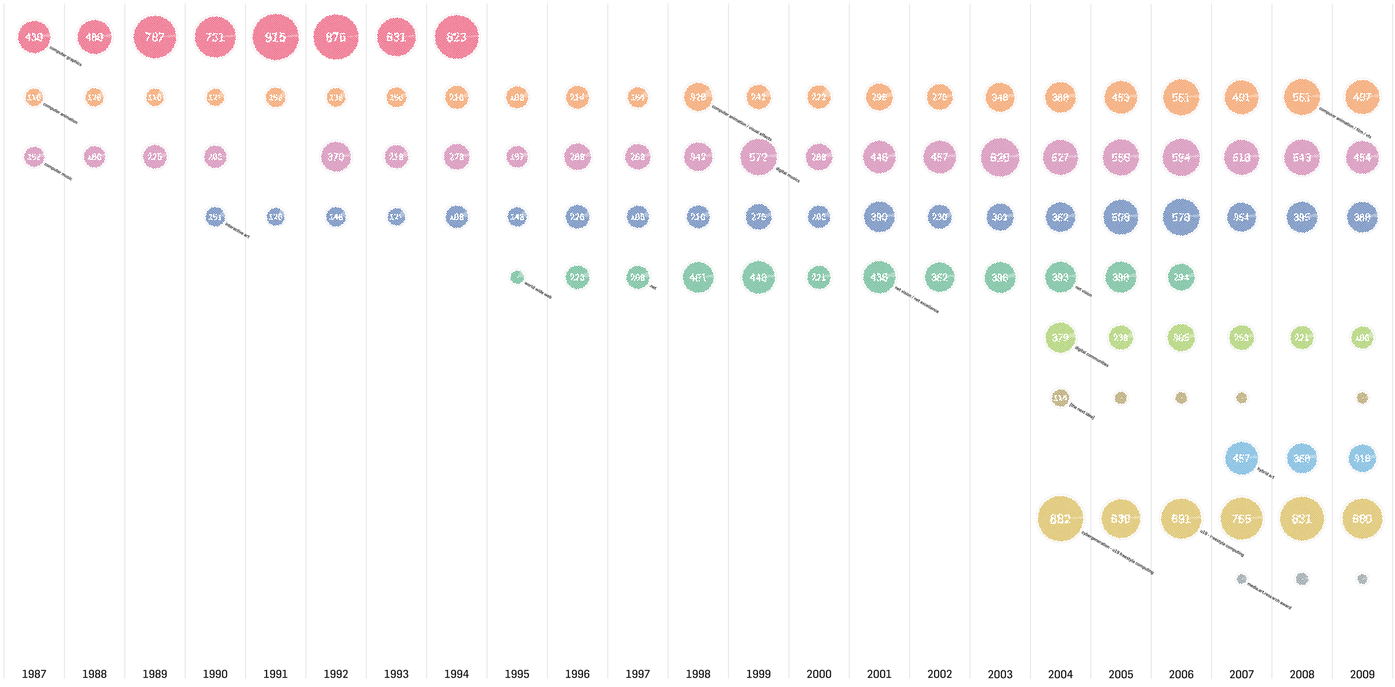 A quantitative analysis of the submissions by category. At the same time, it provides a sense of the fraction of awarded projects per category - the fainter pie, composed of diamond shapes in the right of each circle. Although being around for only 7 years, the computer graphics category has the highest number of submissions overall (unless we combine Computer Musics and Digital Musics).By Year