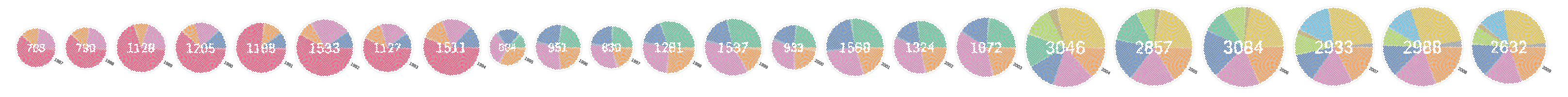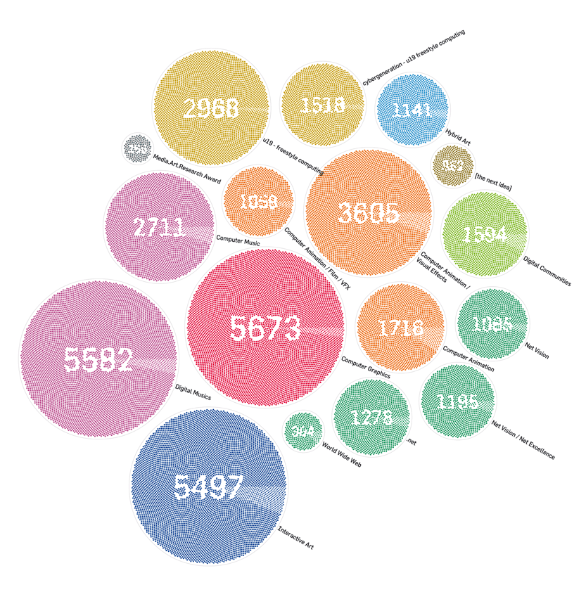 This graphic shows all submissions to the prix ars electronica over the last 22 years. Each dot symbolizes one submission. Resembling a tree cross–section, the oldest submissions are located at the center, surrounded by more recent ones. It constitutes the starting point for all the other graphics, which are a split-up version of this one, analyzing the data according to different criteria.By Prize
