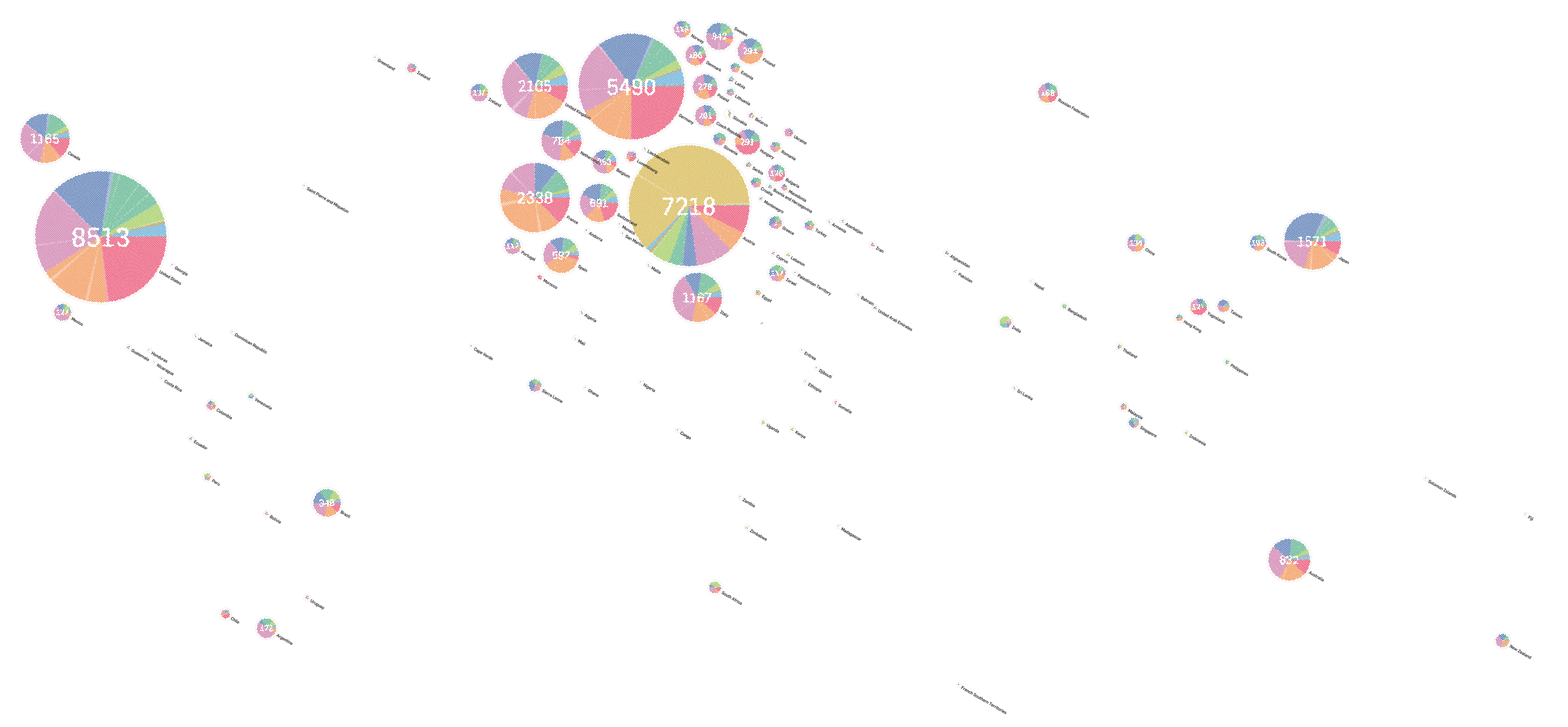 A map diagram of the submitters' countries of origin. Inspired by the New York Times' map of olympic medals, the layout is calculated with a physical rigid body model, trying to approximate the exact locations, while avoiding circle overlap. The whole of eastern europe was manually positioned, however, as things were pretty messed up there.